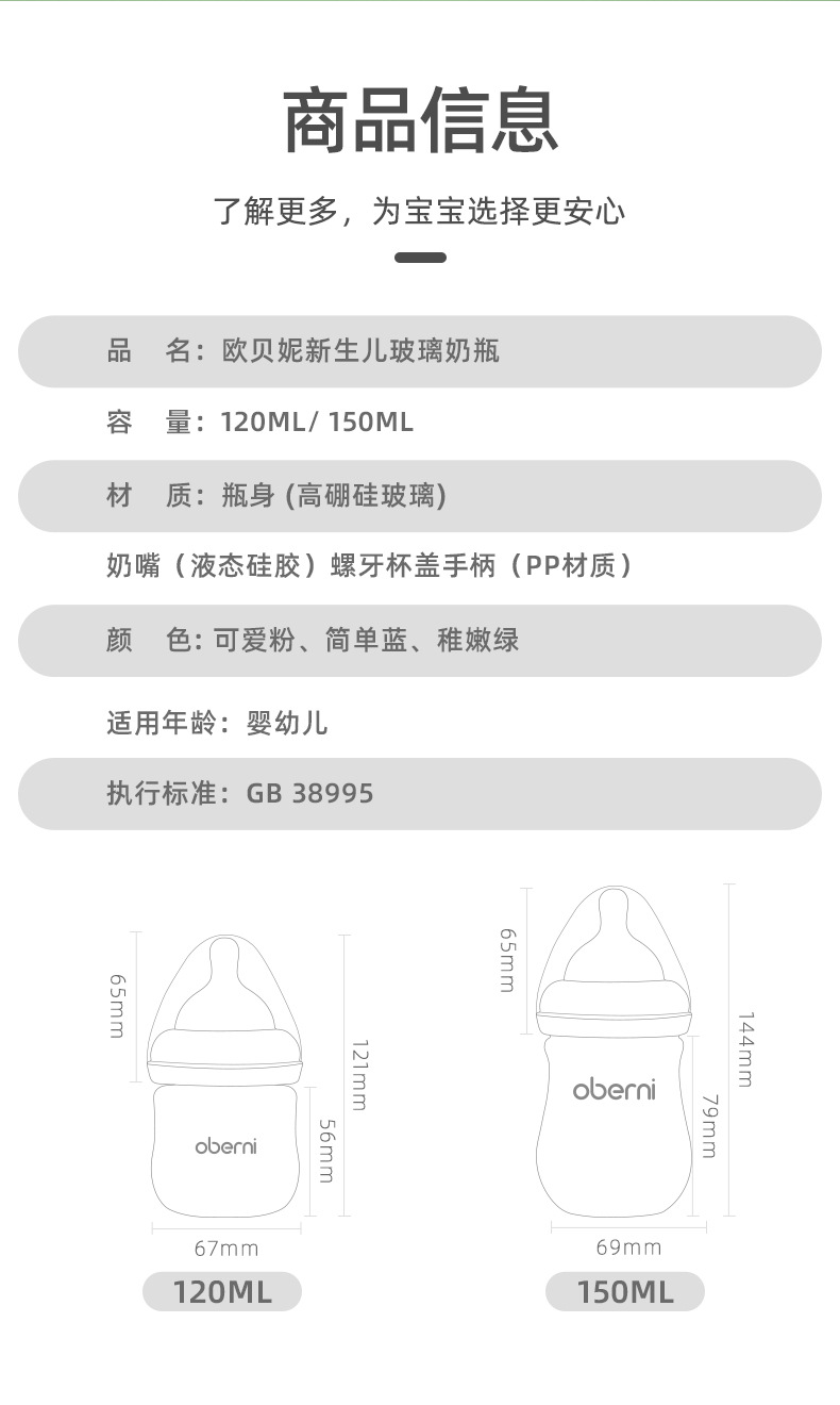 欧贝妮150ML新生儿玻璃奶瓶宽口径防呛防胀气宝宝奶瓶婴儿0-6个月