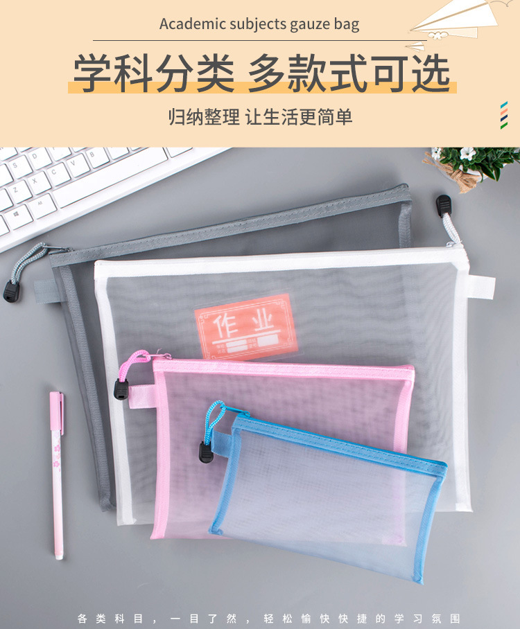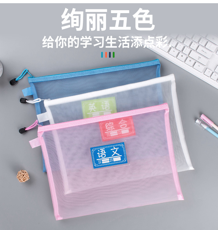学科科目袋分类文件袋双层拉链大容量学生作业袋透明网纱A4资料袋