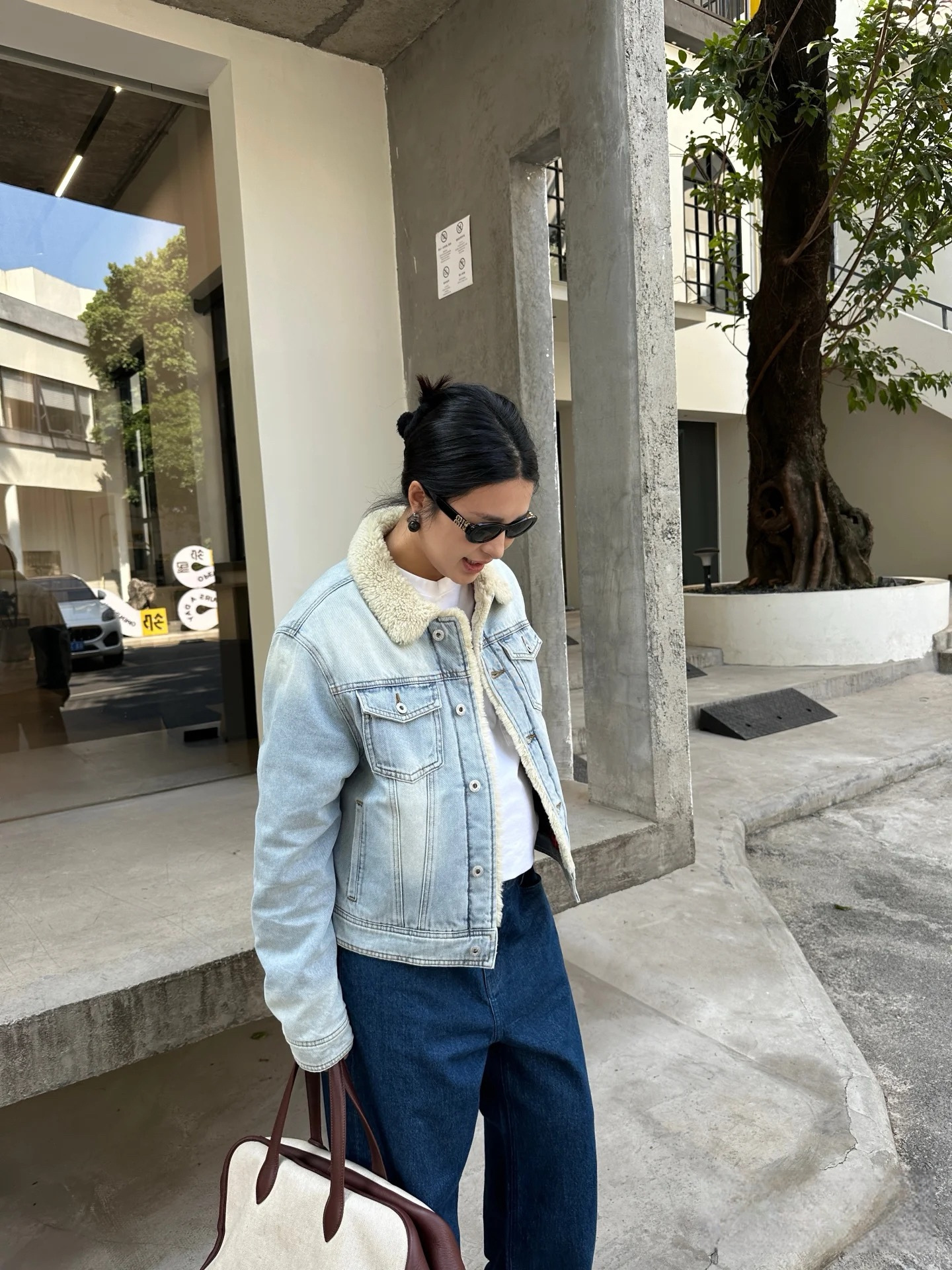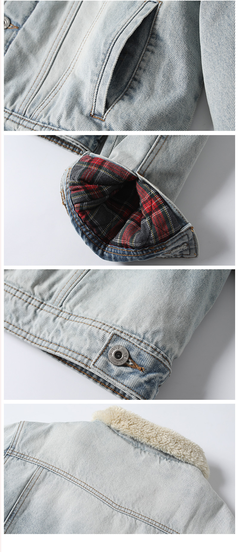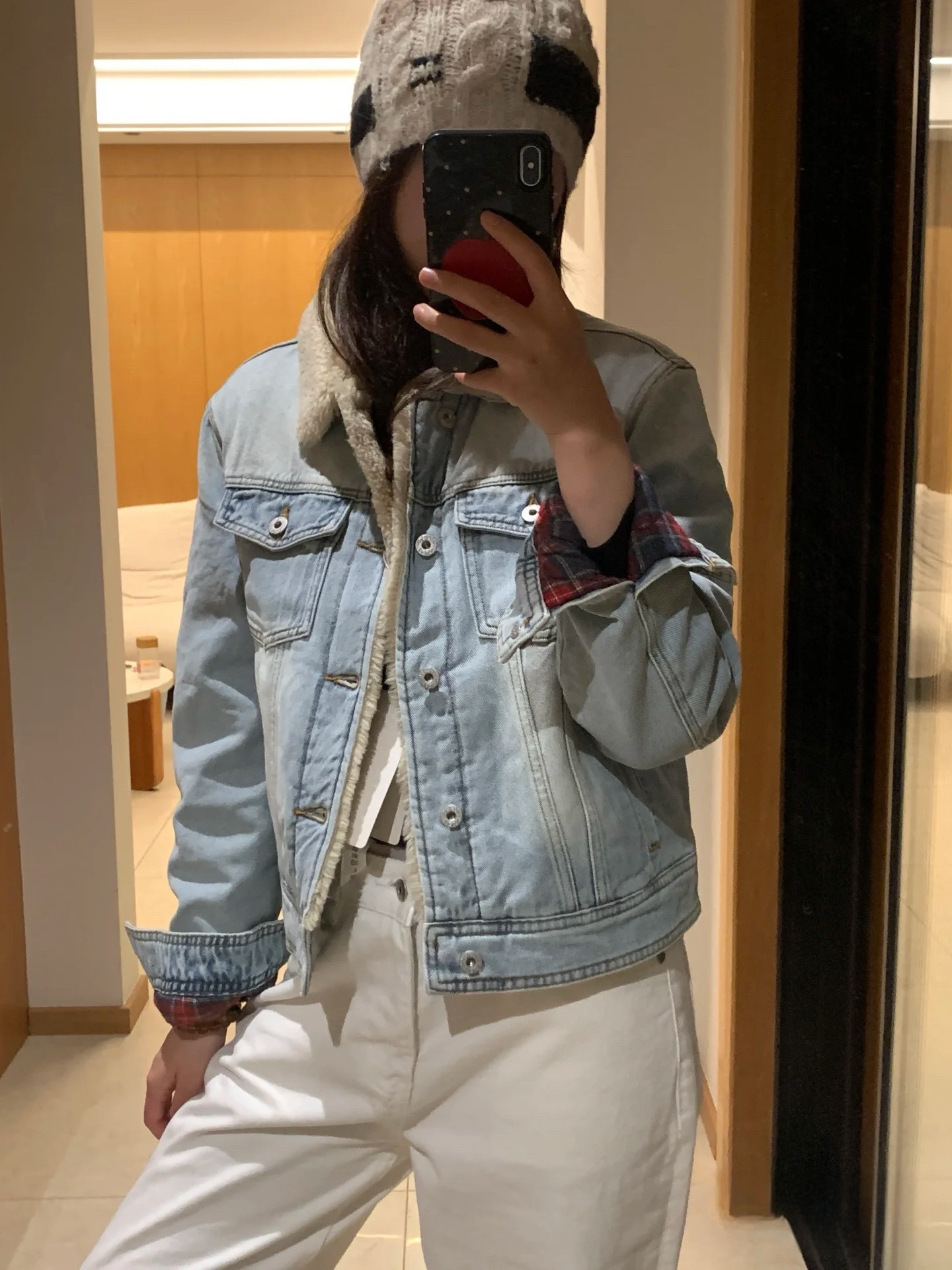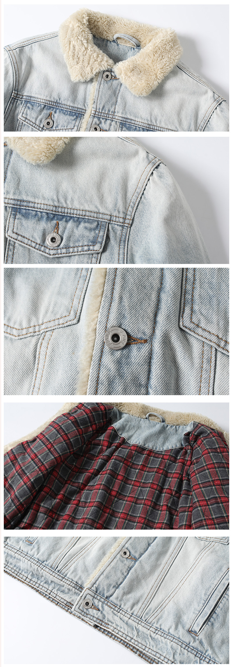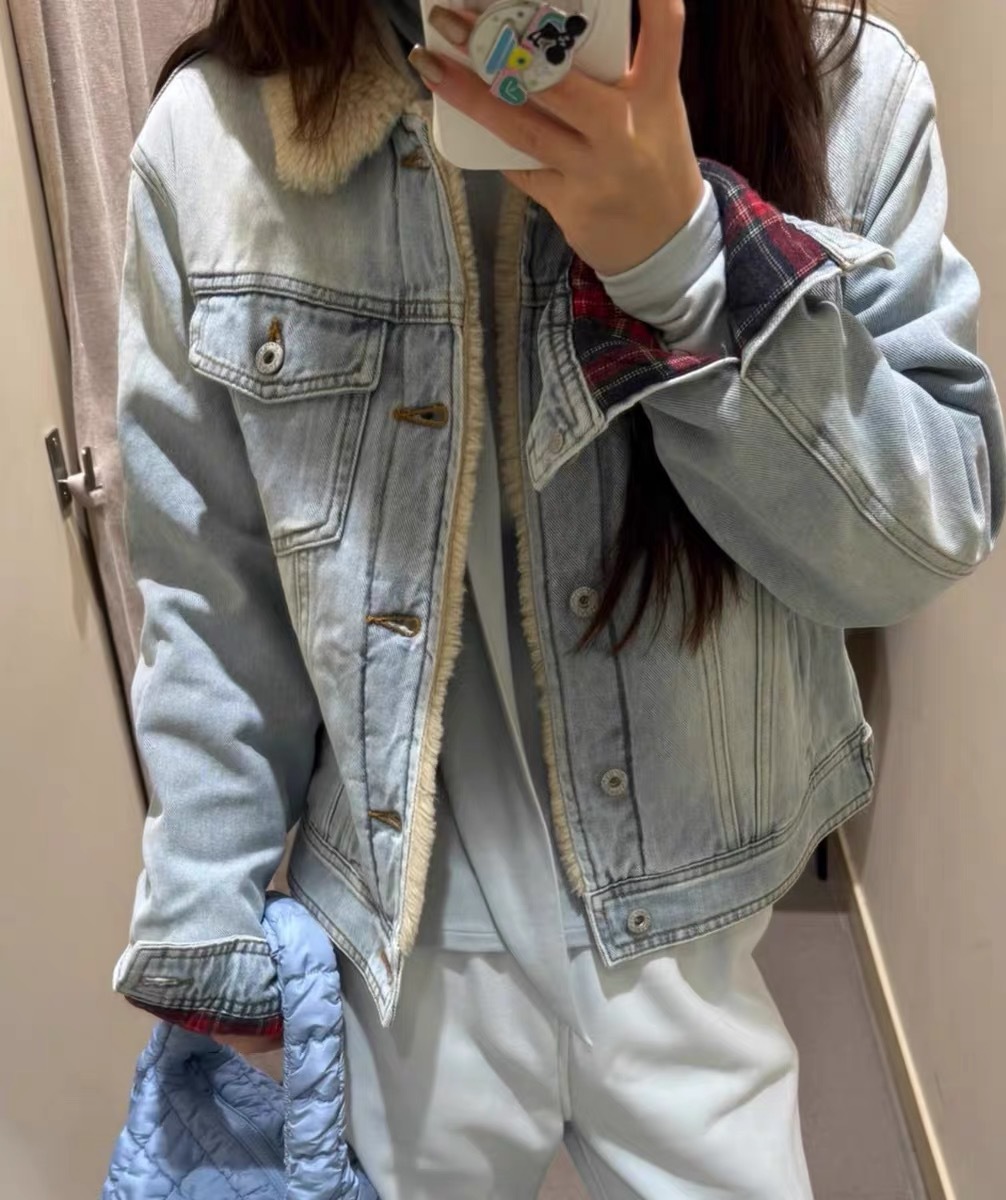 秋冬新款格纹内里加厚羊羔毛夹棉牛仔水洗复古棉服夹克外套女5023