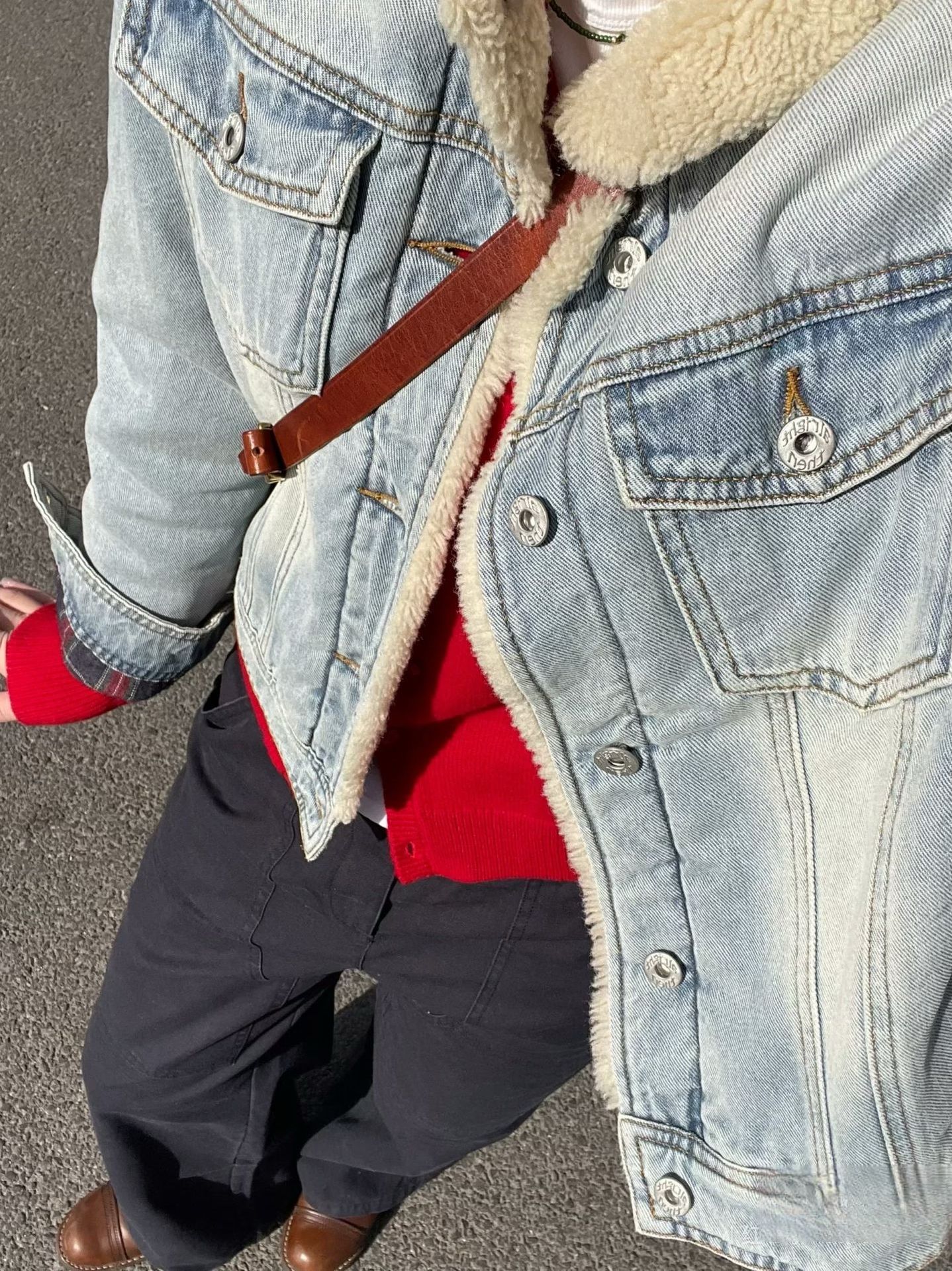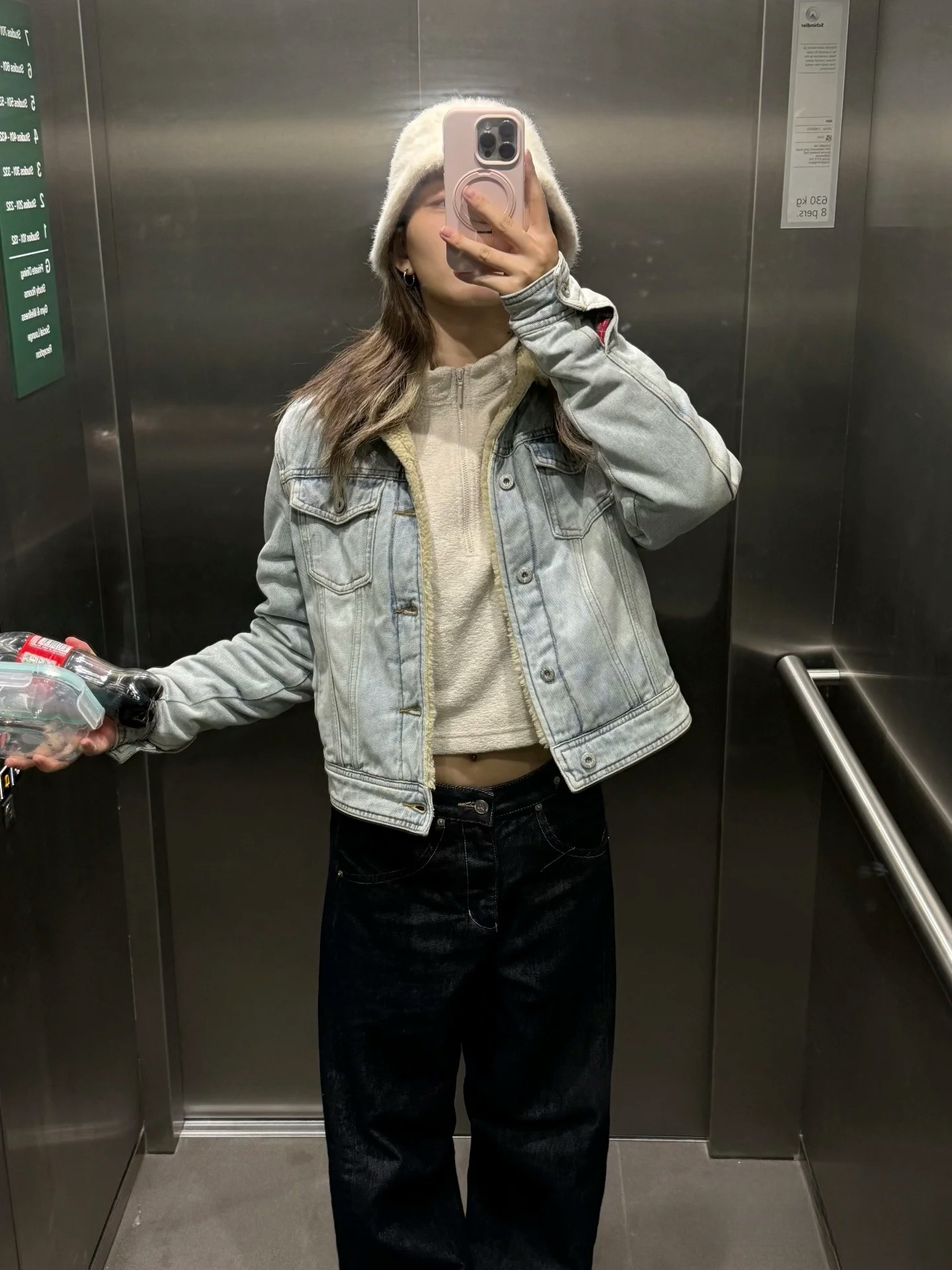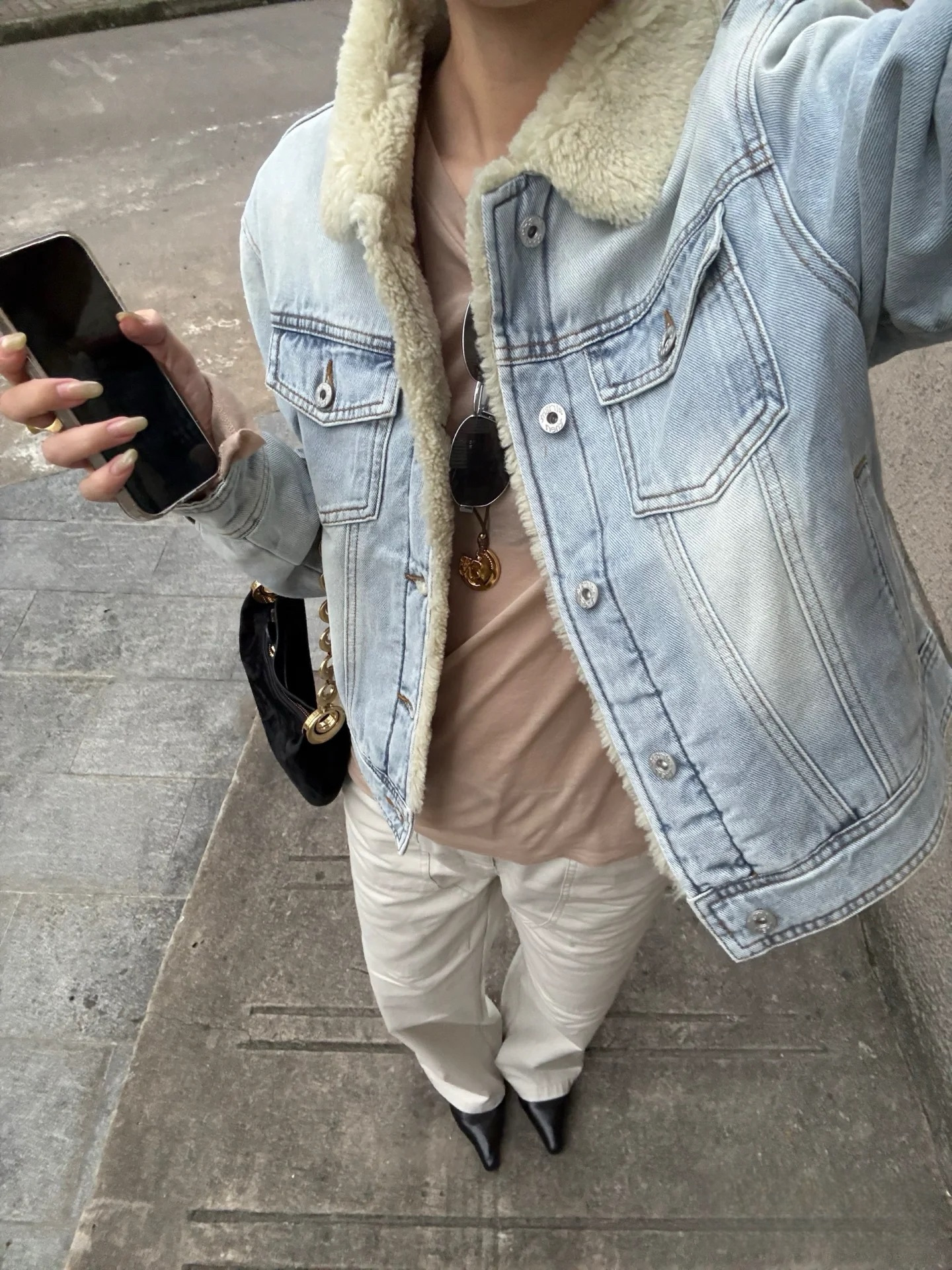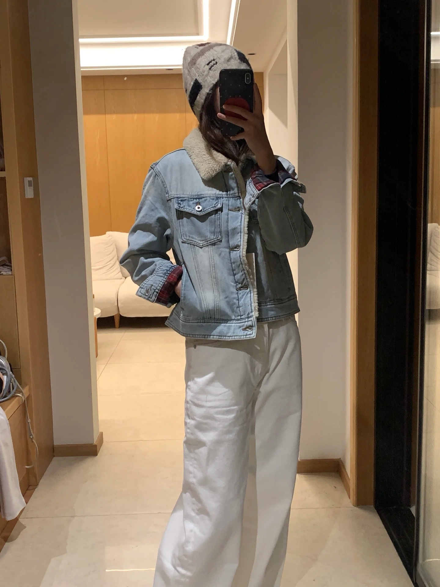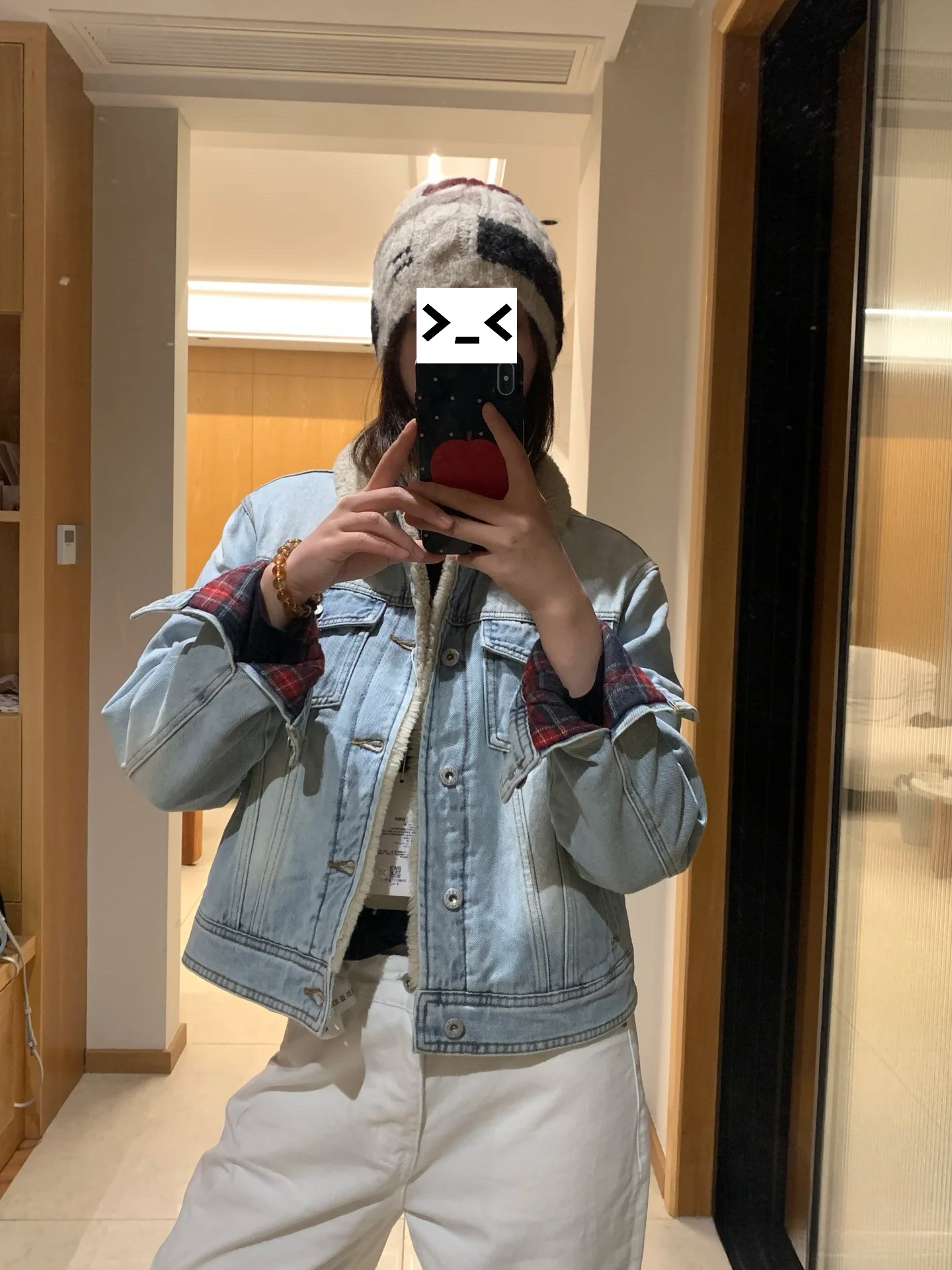 秋冬新款格纹内里加厚羊羔毛夹棉牛仔水洗复古棉服夹克外套女5023